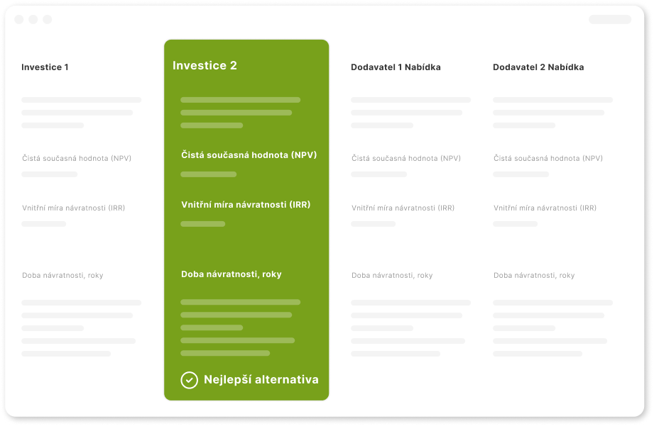 Zrychlete proces investičního rozhodování díky konzistentním přístupům, srovnatelným výpočtům a přehledným zprávám.