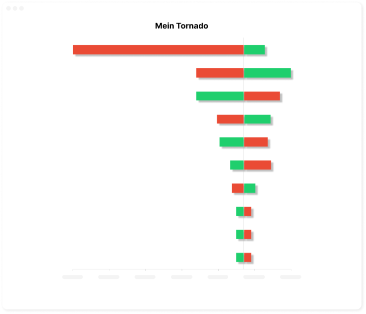 Nutzen Sie die eingebaute "Was-wäre-wenn" Sensitivitätsanalyse, um Ihr Modell zu analysieren. Wählen Sie Variablen aus dem Modell flexibel aus. Erstellen Sie mit Leichtigkeit personalisierte Tornado-Sensitivitätsdiagramme und Spider-Sensitivitätsdiagramme - fügen Sie der Analyse per Mausklick Parameter hinzu. Entdecken Sie die Variablen, die den größten Einfluss auf die Rentabilität haben.