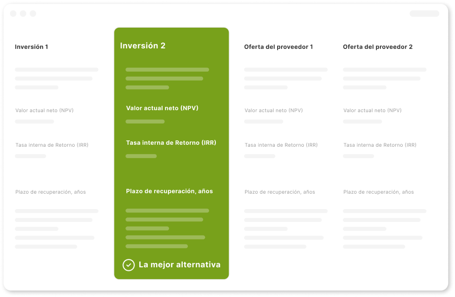 Lo que puede parecer complejo y difícil se convierte en factible con el software Invest for Excel®. La estandarización es la clave de un presupuesto de capital de alto rendimiento. Garantice la coherencia en los cálculos, lo que permite realizar comparaciones de inversiones, proyectos y planes. Establezca directrices alineadas con su estrategia para tomar mejores decisiones.