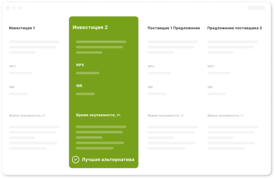Ускорьте процесс принятия инвестиционных решений благодаря последовательным подходам, сопоставимым расчетам и содержательным отчетам.